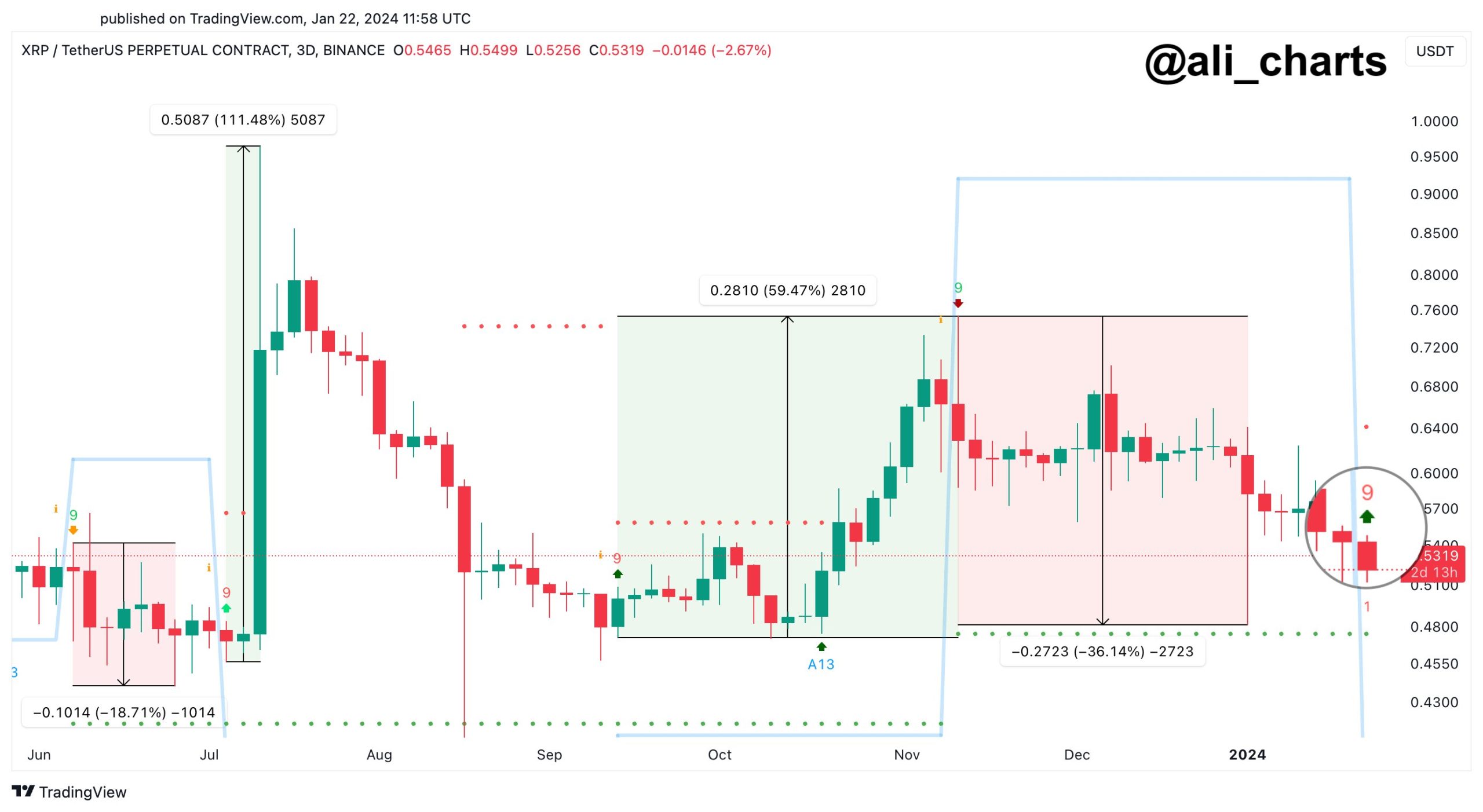 XRP just lately completed the previous kind of part for the TD Sequential on its 3-day value, because the chart shared by the analyst under reveals: