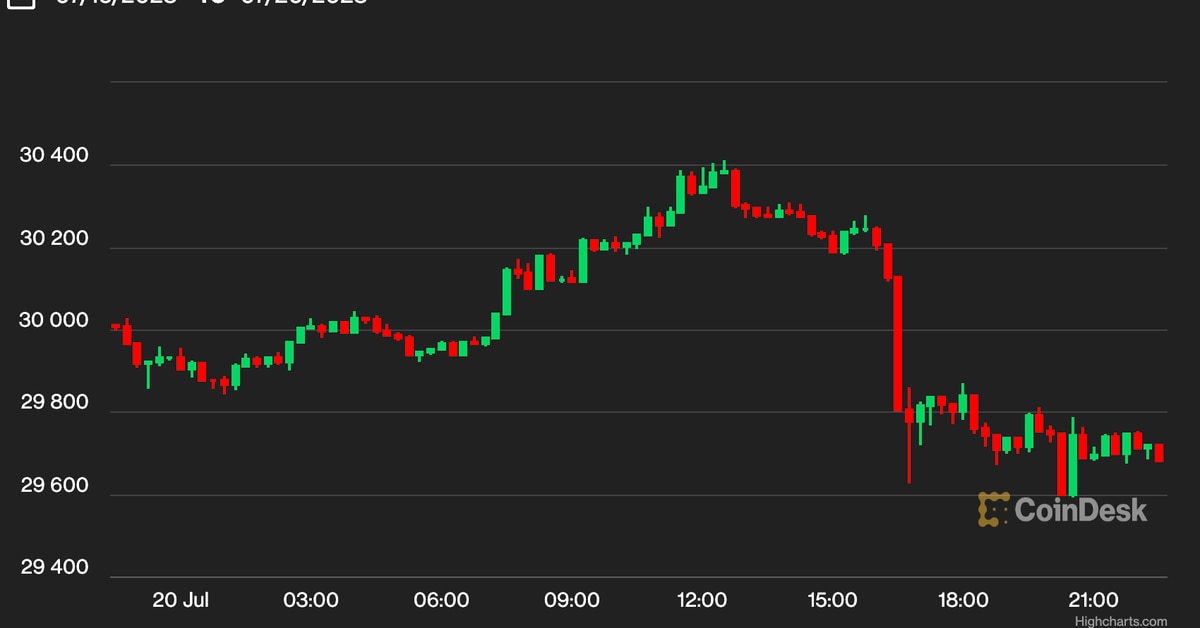BTC’s value dipped to as little as $29,593 through the afternoon hours, close to its lowest level in a month. The most important cryptocurrency by market worth has been see-sawing in a good channel since June 21, bouncing from the $29,500 stage a number of occasions to commerce as excessive as $31,809.