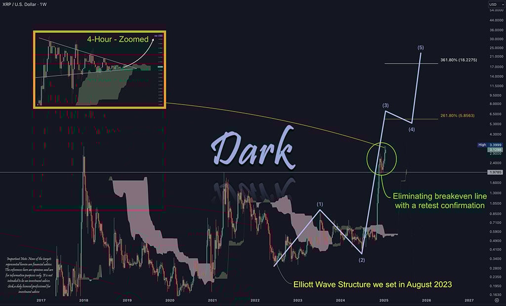 The anticipation builds upon the Elliott Wave construction outlined in August 2023. That construction highlighted a five-wave sample, pointing to robust bullish momentum. The third wave, seen as pivotal within the idea, is anticipated to propel XRP to $5.85.