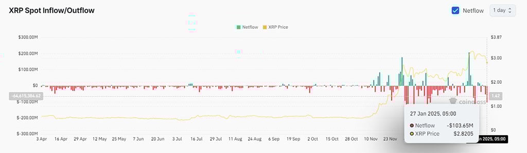 Nevertheless, current XRP netflow information signifies a major outflow of $103.65 million on January 27, suggesting bearish sentiment as traders transfer funds out of exchanges. Traditionally, massive outflows typically mirror lowering market confidence or profit-taking, aligning with the worth drop from earlier highs close to $3 to $2.82.
